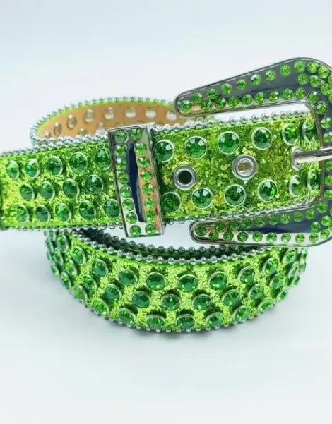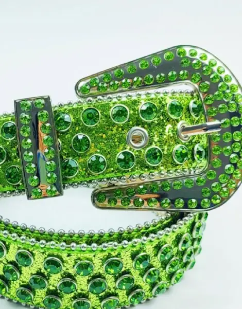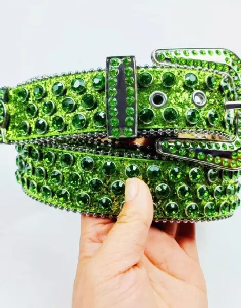 Our Y2K emerald belt is the accessory that makes all the difference. With its 115 cm sparkling length, it fits every style and silhouette. Crafted in top-quality faux leather and studded with imitation diamonds, these Green Y2K Belt built to last and shine. Unisex and versatile, it embodies the rebellious, flashy attitude of the “Trashy Y2K” subculture, making every outfit unforgettable.