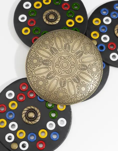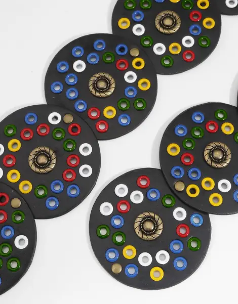 This Y2K Circle Belt, with its futuristic vinyl record look, is the quintessential Y2K accessory. At 110 cm in length, this jewel of a waistband fits perfectly, while metal inserts and PU leather give it a robustness that will stand the test of time. Bursts of vivid color – red, blue, green and more – emerge from the darkness of the black background, like jewels on a canvas at night, capturing the essence of an era when fashion was bold and expressive.