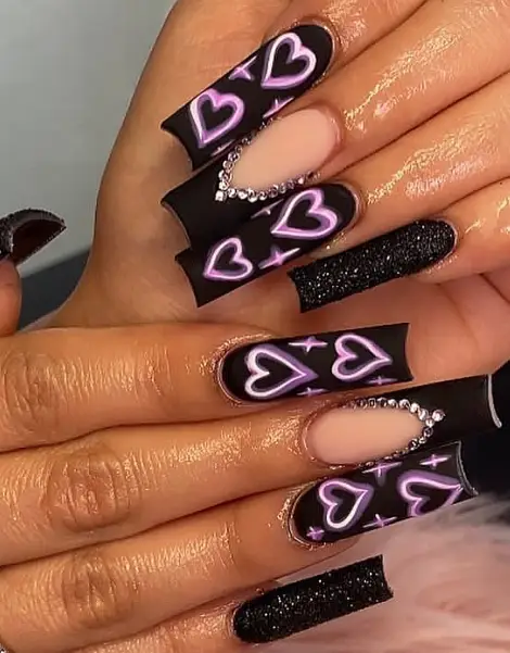 Experience Y2K nostalgia with an emo twist: these long square nails are a work of art!Shades of deep black and purple, accented with glitter and captivating heart motifs, they’re crafted to accentuate your style. Perfect for those who want to assert their individuality, these Y2K Emo Nails are the epitome of emo chic from the Y2K period.