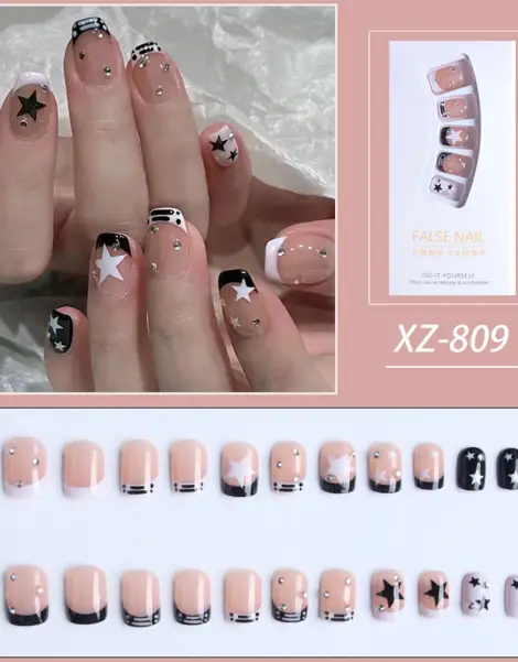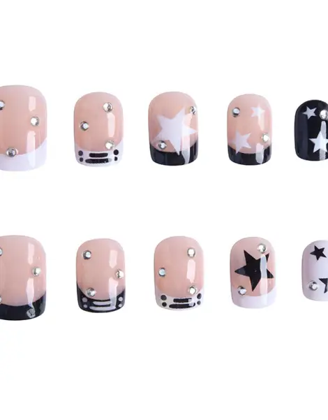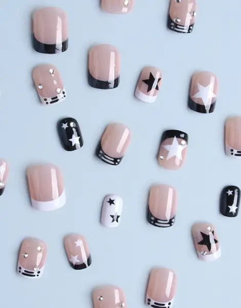 With their sturdy acrylic design and short square shape, these false nails embody the Y2K aesthetic trend. Each piece is a style statement with stud and star detailing, offering a palette of black, white and silver that captures the spirit of punk, aesthetic minimalism and Japanese chic. These Y2K French Nails are the quintessential Y2K style, a perfect fusion of 2000s audacity and contemporary chic.