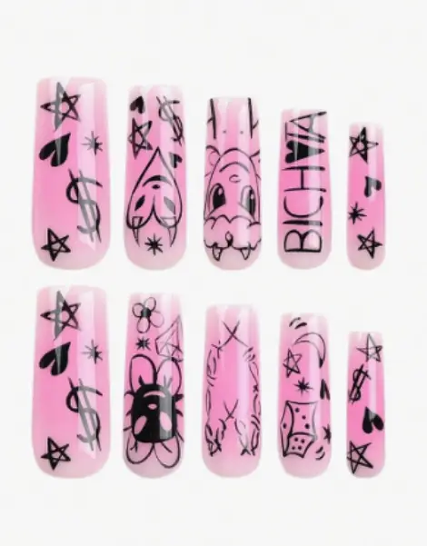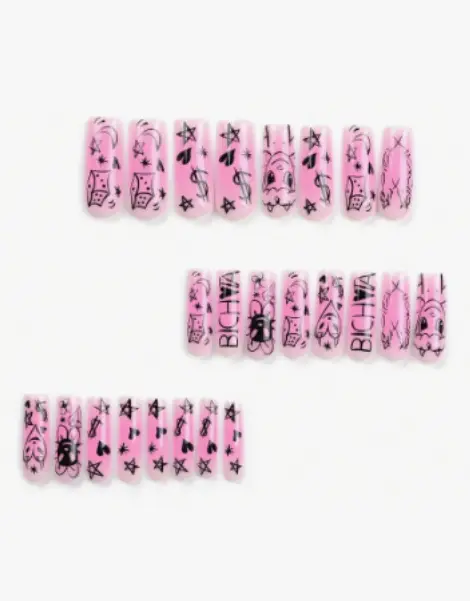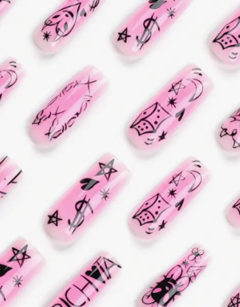 These square long nails embody the iconic aesthetic of the Y2K era. With bold graffiti motifs, glittering stars, and touches of hearts and diamonds, they evoke a style that’s both trashy and aesthetically pleasing. The black and pink palette captures the essence of Y2K emotion, while every detail, from the mischievous demon to the delicate flower, adds to the visual complexity. These Y2K Nails Aesthetic aren’t just accessories; they’re emblems of an entire subculture.