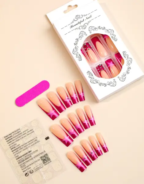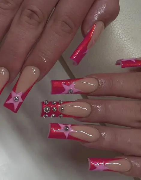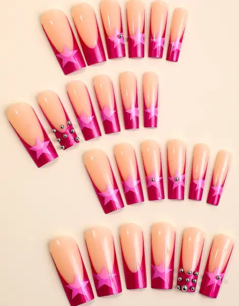 These long, streamlined false nails, in vivid colors of pink, red and silver, are the perfect expression of the Y2K revival.Each nail is a canvas, adorned with metallic elements and star patterns, capturing the punk aesthetic spirit of the time. With their elongated coffin look, they’re not just a fashion accessory, but a veritable banner of a bygone era, brought up to date.