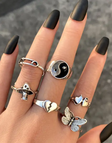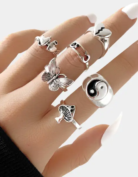 With its retro design and zinc alloy construction, this Y2K Vintage Ring is a nod to the goth, punk and vintage trends of the 2000s. Unisex and versatile, it features captivating motifs – heart, mushroom, yin and yang, butterfly – each telling its own story. This jewel is not just an accessory, it’s a collector’s item that exudes the character of the turn of the millennium.